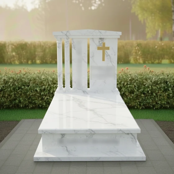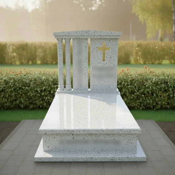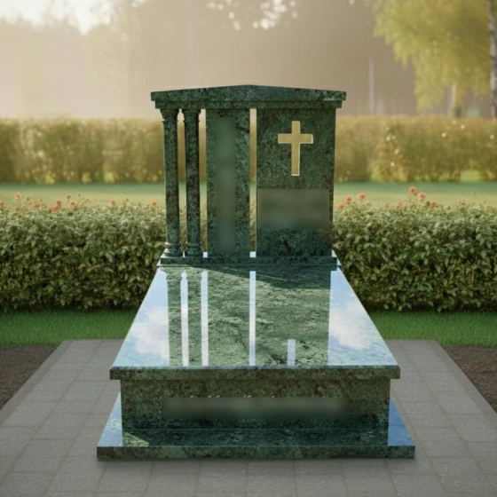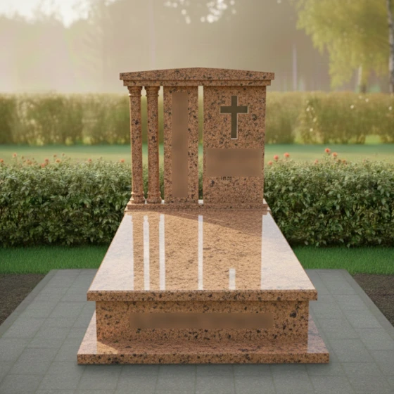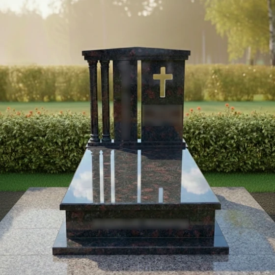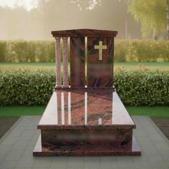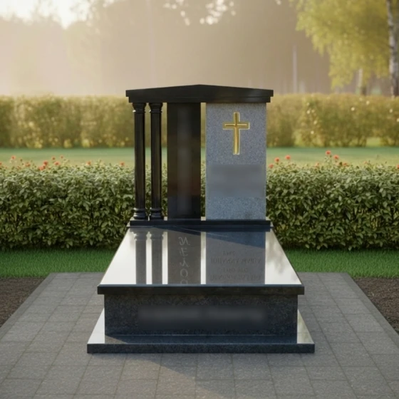 Данное ритуальное изделие представляет собой воплощение архитектурного благородства и художественной глубины. В основе композиции лежит сложная многоуровневая структура, напоминающая античный портал или вход в священную обитель. Левая часть стелы оформлена двумя изящными круглыми колоннами, которые поддерживают массивный венчающий карниз. Эти тонкие элементы создают удивительную игру ритма, пропуская через себя пространство и свет, что придает тяжелому камню легкость и возвышенность. Центральная часть композиции — вертикальная вставка из глубокого черного камня, которая служит идеальным контрастным фоном для всей конструкции, подчеркивая строгость и торжественность момента.