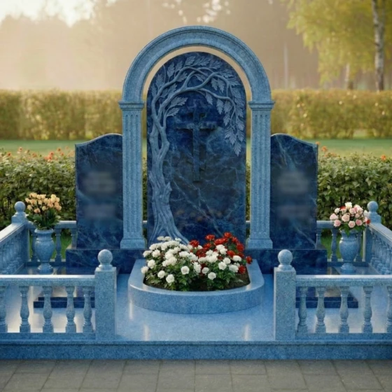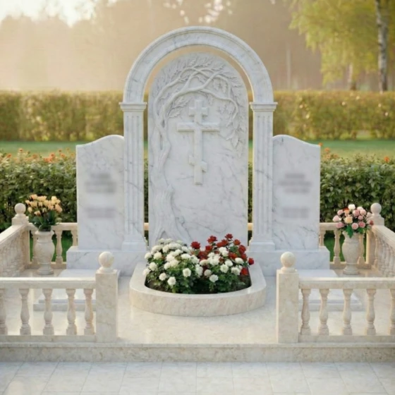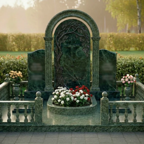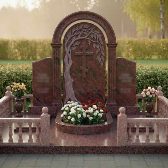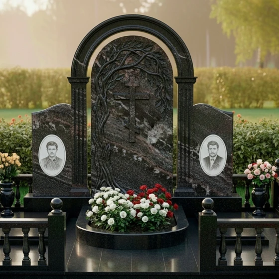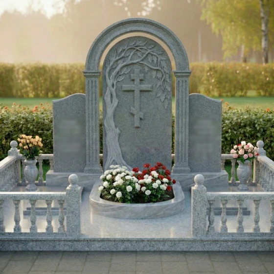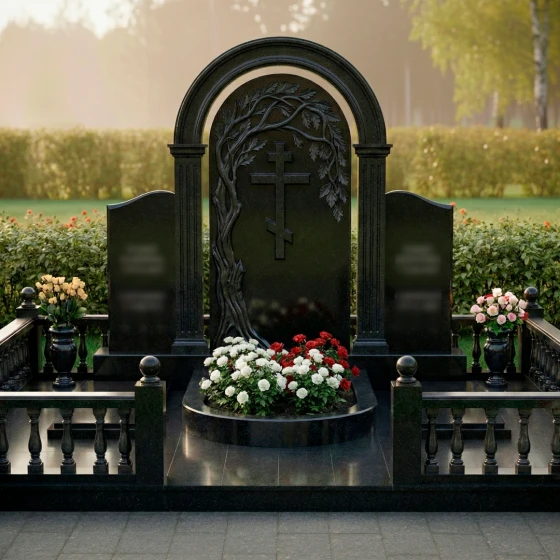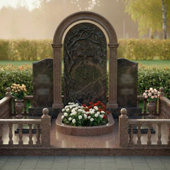 Данный мемориальный ансамбль представляет собой не просто место памяти, а целостное архитектурное решение, спроектированное с учетом законов гармонии и вечности. Центром композиции является величественная стела, выполненная в виде классической арки, опирающейся на две строгие колонны с канелюрами. Внутри арочного свода расположен глубокий барельеф: раскидистое дерево, чьи ветви бережно склоняются над лаконичным православным крестом. Мастерски выполненная резьба передает каждую деталь — от фактурной коры ствола до объема каждого листика, создавая выразительный контраст между матовым резным камнем и зеркальной поверхностью основной плиты. Триединая форма стелы позволяет гармонично объединить память о нескольких близких людях, сохраняя при этом индивидуальность каждого образа на боковых плитах с изящно скругленными навершиями.