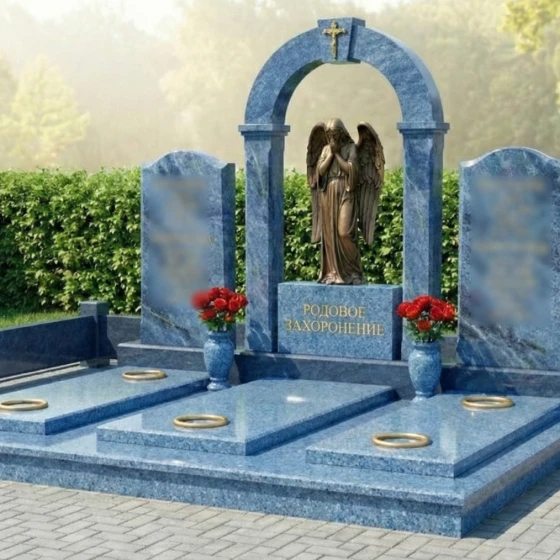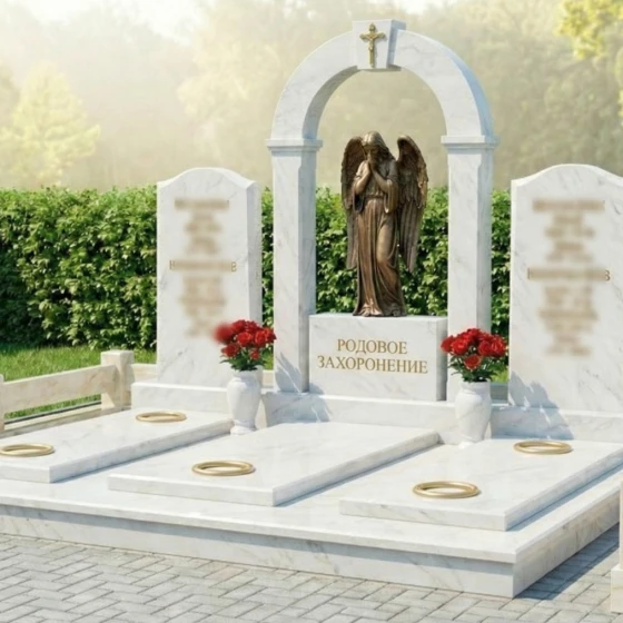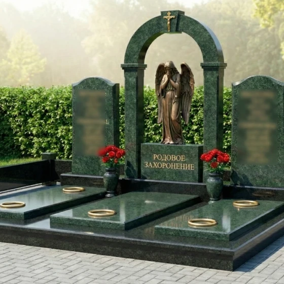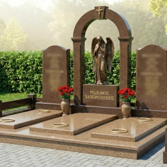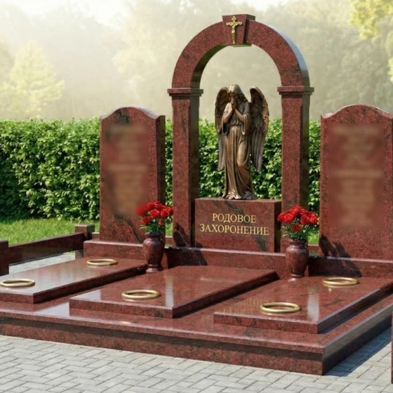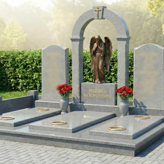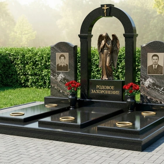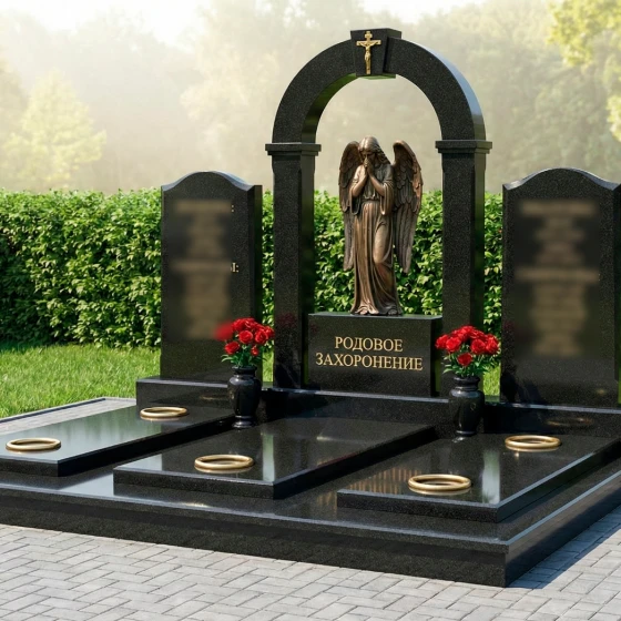 Каждая деталь этого комплекса наполнена глубоким смыслом. Арка в ритуальной архитектуре традиционно символизирует небесные врата и переход души в лучший мир, являясь своеобразным порталом между земным и вечным. Фигура ангела выступает в роли божественного заступника и хранителя покоя душ, привнося в облик захоронения атмосферу умиротворения и надежды. Наличие двух стел и трех надгробных плит подчеркивает семейный статус захоронения, создавая единый пантеон, где близкие люди остаются вместе даже после завершения земного пути. Строгие линии основания в сочетании с изящной резьбой говорят о балансе между земной твердостью и небесной легкостью.