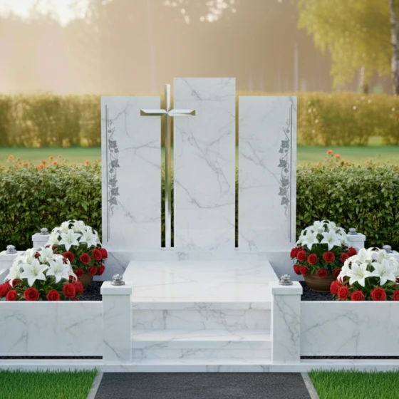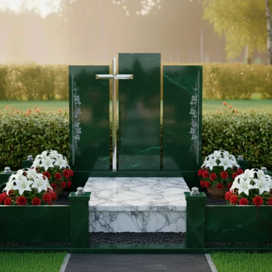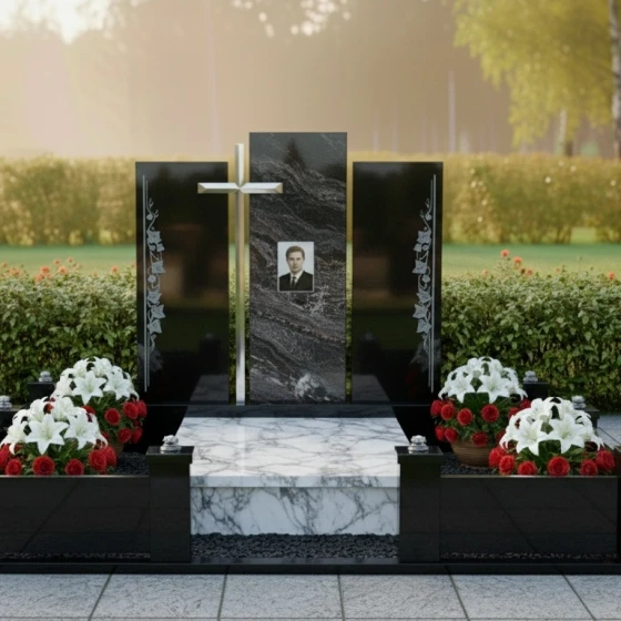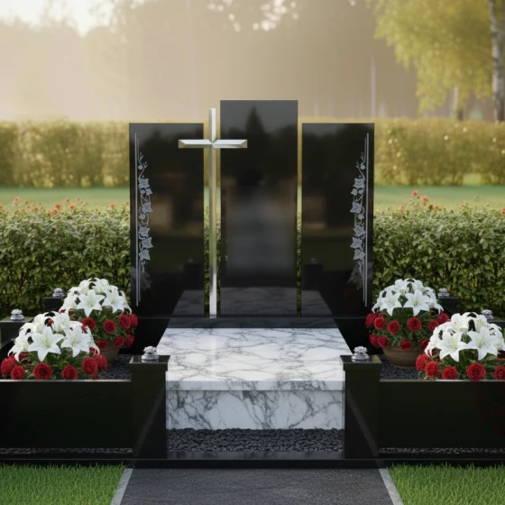 Особое внимание привлекает четырехконечный крест, который словно пронзает плоскость камня. Он выполнен в лаконичном стиле с акцентированными гранями, создающими игру света и тени, что придает распятию объем и визуальную легкость. На боковых стелах методом художественной гравировки нанесен растительный орнамент. Изящные ветви с детально проработанными листьями и бутонами цветов создают мягкий эстетический контраст с массивными каменными блоками, символизируя вечное цветение жизни в памяти потомков.