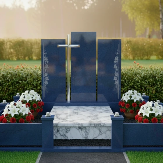Данное надгробие из натурального камня представляет собой сложную трехчастную композицию, состоящую из вертикальных стел разной высоты. Центральный элемент, возвышающийся над боковыми панелями, служит композиционной осью всего ансамбля. Геометрия изделия отличается безупречной строгостью: идеально ровные грани и острые углы создают образ непоколебимой крепости и защиты. Фаски на краях панелей выполнены с ювелирной точностью, что позволяет зеркально полированной поверхности ловить малейшие лучи света, создавая эффект внутреннего сияния.