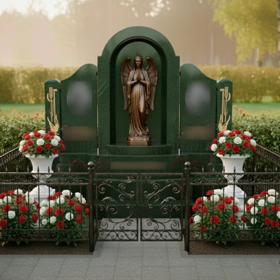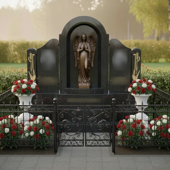 Этот мемориал задуман как законченное архитектурное решение. Монумент установлен на мощный многоуровневый постамент, который визуально приподнимает композицию, придавая ей особую торжественность. В состав комплекса входят две классические белоснежные вазы, установленные на собственных пьедесталах. Они вносят в общую палитру свежий акцент и позволяют аккуратно размещать живые цветы, поддерживая порядок на участке. Завершает оформление изящное кованое ограждение с ажурными завитками, которое четко очерчивает границы мемориала, создавая атмосферу уединенности и защищая покой этого священного места. Единая система мощения и отсутствие открытого грунта гарантируют безупречный вид участка на десятилетия при минимальном уходе.