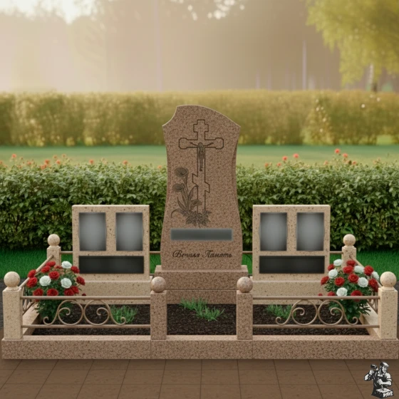 Особое внимание уделено благоустройству участка. Мемориал установлен на прочный гранитный цоколь, который служит надежным фундаментом для всей композиции. По периметру расположены массивные столбики, увенчанные декоративными каменными шарами — символами вечности и завершенности жизненного пути. В пространство между столбиками интегрировано изящное кованое ограждение с классическим орнаментом, которое очерчивает границы участка, создавая атмосферу уединения и покоя. Наличие открытых цветников внутри цоколя позволяет оформить место захоронения живыми растениями или декоративным камнем, придавая участку ухоженный и законченный вид.