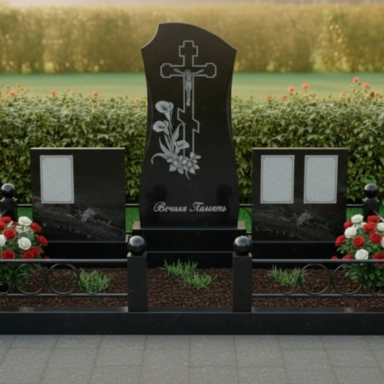 Представленная мемориальная композиция — это величественный ансамбль, созданный для оформления родового захоронения на четыре персоны. В центре художественного решения находится высокая вертикальная стела с изящным асимметричным изгибом навершия, напоминающим застывшую в камне волну. На фасадной части центрального элемента выполнена искусная резьба: лаконичный православный крест с детализированным распятием возвышается над пышным букетом калл. Тонкая проработка лепестков придает цветам визуальный объем и нежность, которая особенно эффектно смотрится на фоне зеркальной полировки камня. Игра контрастов между черной блестящей поверхностью и светлыми матовыми линиями гравировки создает ощущение глубины и одухотворенности.