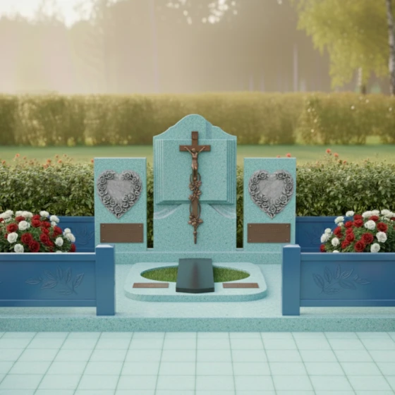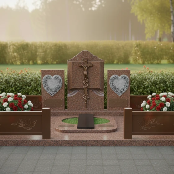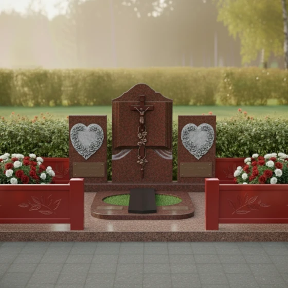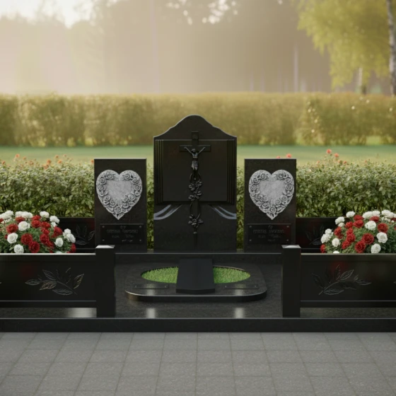 Каждая деталь этого комплекса наполнена глубоким смыслом. Форма книги — это символ мудрости и памяти, которая никогда не будет стерта. Сердца, обрамленные цветами, олицетворяют бесконечную любовь и нежность, оставшуюся в сердцах живых. Строгие вертикальные линии в сочетании с плавными изгибами резьбы создают баланс между мужской твердостью и женской мягкостью, что делает этот гранитный монумент идеальным выбором для парного или семейного захоронения. Массивность конструкции внушает чувство защищенности и вечного покоя, превращая участок в настоящий мемориальный храм под открытым небом.