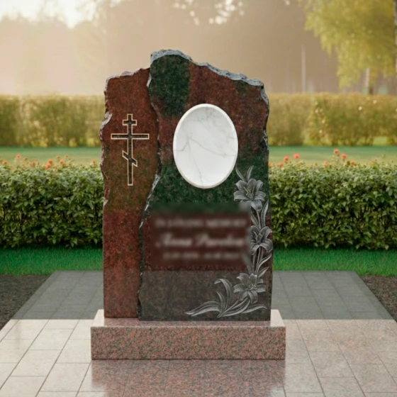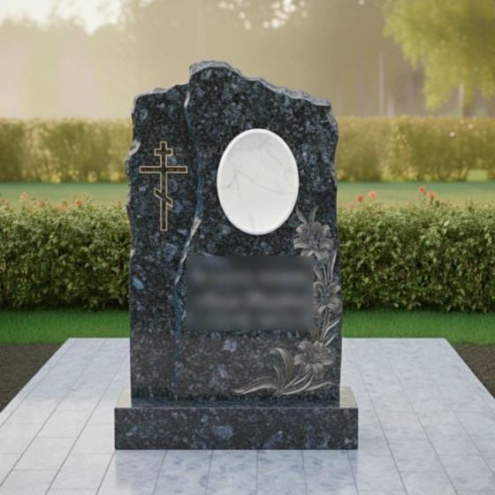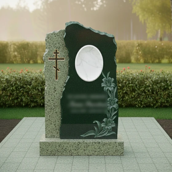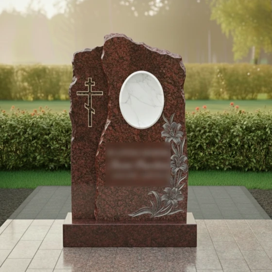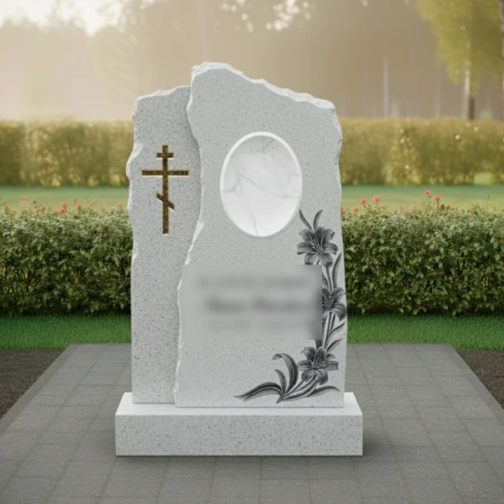 - Художественные элементы: Рельефная резьба в виде лилий, гравированный православный крест, подготовленная ниша под керамический или мраморный портретный медальон.