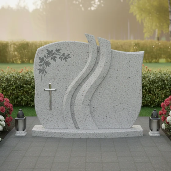 Величественная стела ПН 701 представляет собой уникальное сочетание классической элегантности и современной динамики. Основа стелы – это массивная плита из глубокого черного гранита, чья идеально отполированная поверхность отражает мир вокруг, словно зеркало, символизируя чистоту души и бесконечность памяти. Верхняя часть стелы имеет плавный, волнообразный изгиб, который придает ей ощущение легкости и устремленности вверх, словно душа, возносящаяся к небесам. Этот изгиб не просто декоративный элемент; он создан с филигранной точностью, демонстрируя виртуозность работы с камнем. Боковые грани стелы также тщательно обработаны, повторяя общий волнообразный контур, что создает гармоничный и завершенный образ. На левой стороне стелы, на фоне глубокого черного гранита, искусно выгравирована ветвь с нежными листьями, выполненная в технике матовой гравировки. Ее светлый, почти серебристый оттенок контрастирует с зеркальной поверхностью камня, придавая изображению объем и реалистичность. Ниже ветви расположен лаконичный православный крест, также выполненный методом гравировки, его строгие линии подчеркивают духовную составляющую монумента. Центральным элементом композиции являются две вертикальные, изогнутые ленты, выполненные из светлого, мелкозернистого гранита. Эти ленты, словно два потока, переплетаются и устремляются вверх, символизируя неразрывную связь между мирами и вечное движение жизни и памяти. Их матовая, слегка шероховатая фактура создает интересный тактильный и визуальный контраст с полированной черной стелой, подчеркивая глубину и многогранность композиции.