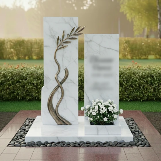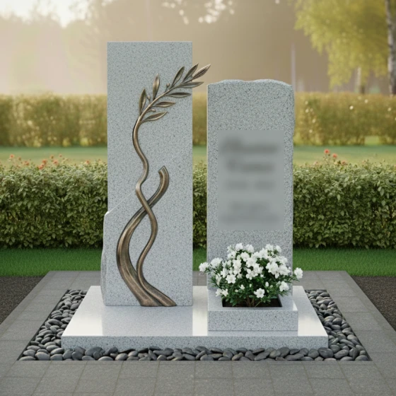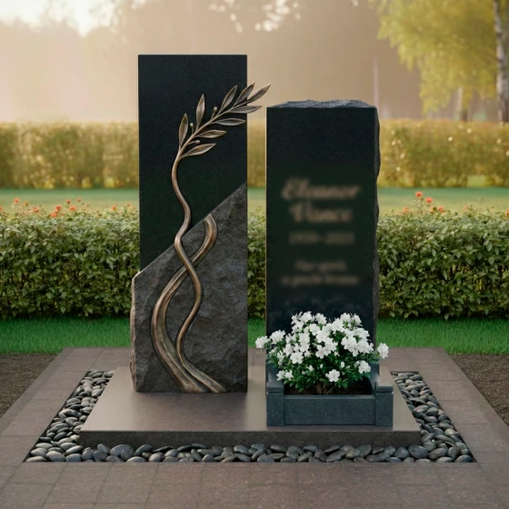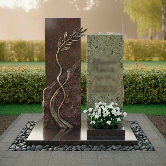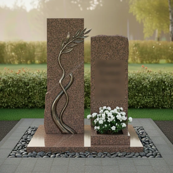 Данная модель представляет собой сложную архитектурную композицию, состоящую из двух вертикальных элементов, гармонично дополняющих друг друга. Левая часть памятника приковывает взгляд необычной игрой фактур: идеально ровная, зеркально отполированная поверхность встречается с диагональным срезом «скальной» фактуры. По этому необработанному, дикому камню изящно вьется объемная бронзовая ветвь с детально проработанными листьями. Каждая прожилка на листе, каждый изгиб стебля выполнены с ювелирной точностью, создавая эффект живого растения, застывшего в вечности. Правый элемент мемориала выполнен в более сдержанном стиле, имея строгую прямоугольную форму, которую венчает «колотая» верхушка, имитирующая естественный разлом горной породы. Такое сочетание безупречной полировки и грубого камня создает неповторимый визуальный контраст, подчеркивающий монументальность изделия.