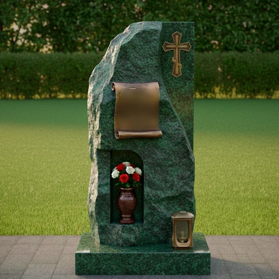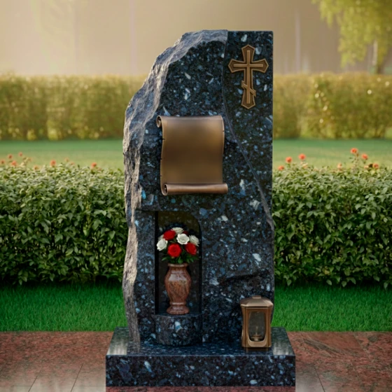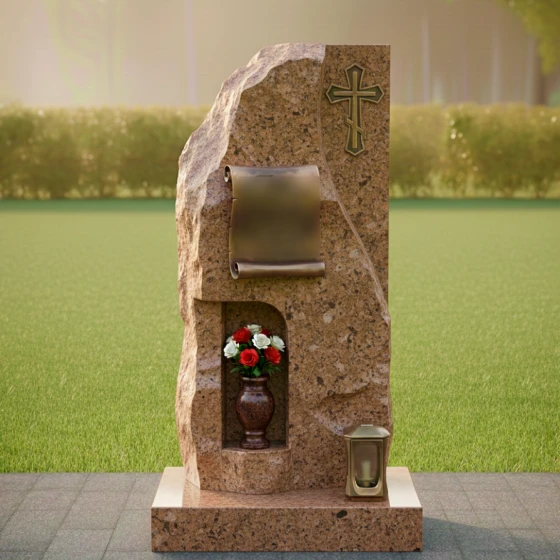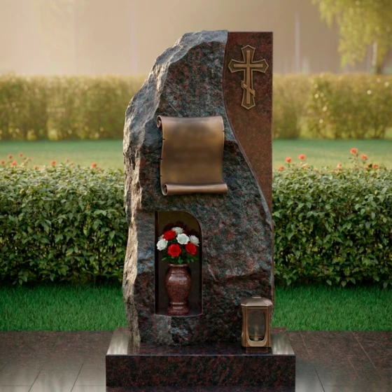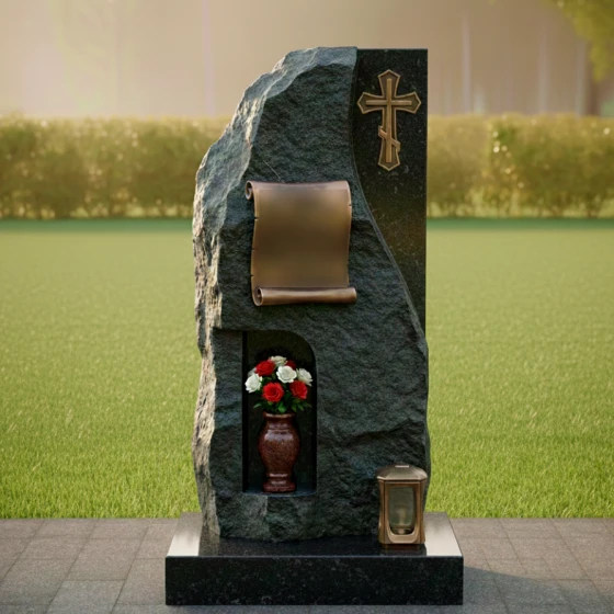 Особого внимания заслуживает художественная интеграция функциональных элементов. В центре композиции расположена накладная панель в форме старинного свитка. Изгибы «бумаги», застывшие в металле, создают объемную доминанту, на которой информация об ушедшем человеке будет выглядеть как страница истории, запечатленная в вечности. В нижней части вертикального блока вырезана глубокая арочная ниша — уникальное конструктивное решение, позволяющее интегрировать вазу с цветами непосредственно в тело камня. Это не только защищает аксессуар, но и создает эффект «живого» памятника, где природа и архитектура сливаются воедино. Массивная подставка служит надежным фундаментом, на котором симметрично расположен декоративный светильник (лампада), завершающий ансамбль и придающий ему монументальную устойчивость.