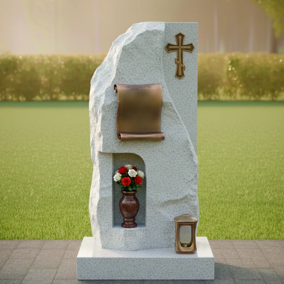 Кому подойдет: Данная модель является универсальным решением для тех, кто ищет сочетание традиционных религиозных символов и современного дизайна. Благодаря возможности выбора цвета и фактуры, памятник одинаково гармонично подчеркнет мужскую силу (в темном граните) или женскую утонченность (в светлых тонах или мраморе). Это выбор для людей, ценящих долговечность, уникальную ручную работу и эстетику «дикого» камня, интегрированного в строгие архитектурные формы.