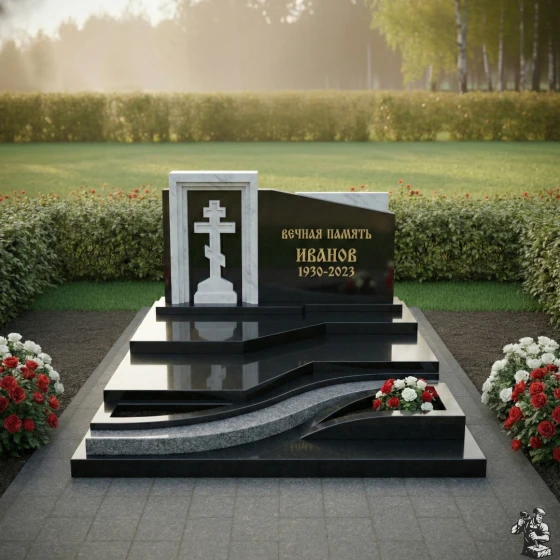 Особого внимания заслуживает многоуровневое благоустройство участка. Вместо привычного открытого грунта используется система каскадных плит, которые полностью закрывают место захоронения. Это не только придает ансамблю законченный, благородный вид в европейском стиле, но и значительно упрощает уход. Ступенчатый цоколь создает ощущение мощи и незыблемости. Изюминкой композиции выступает волнообразная вставка из серого гранита, которая словно лента времени прорезает черные ступени основания, смягчая строгость геометрии и внося в эстетику камня живую динамику. Интегрированный в основание цветник в форме остроугольного лепестка позволяет деликатно добавить живые растения, не нарушая общую монументальную гармонию.