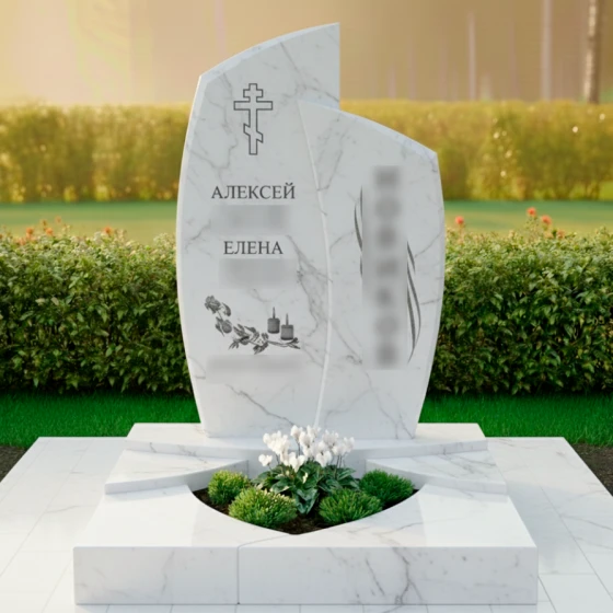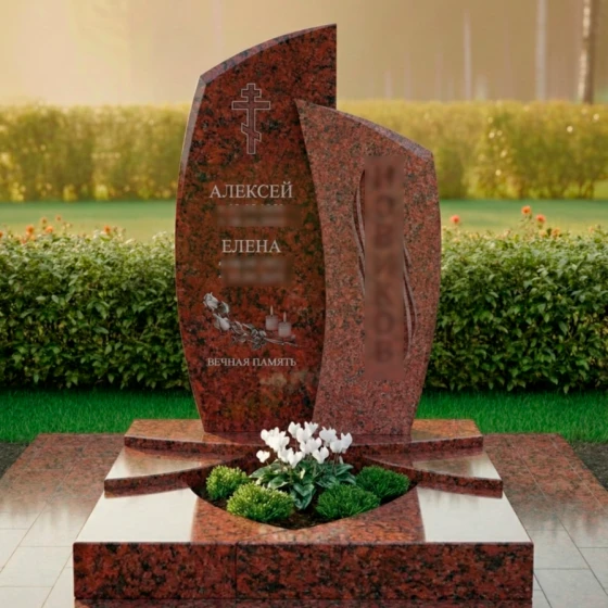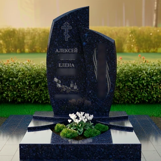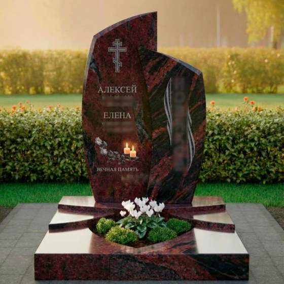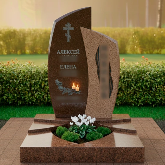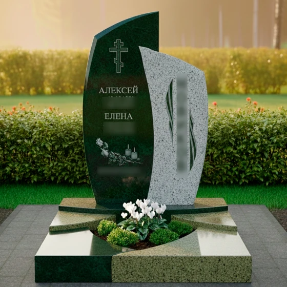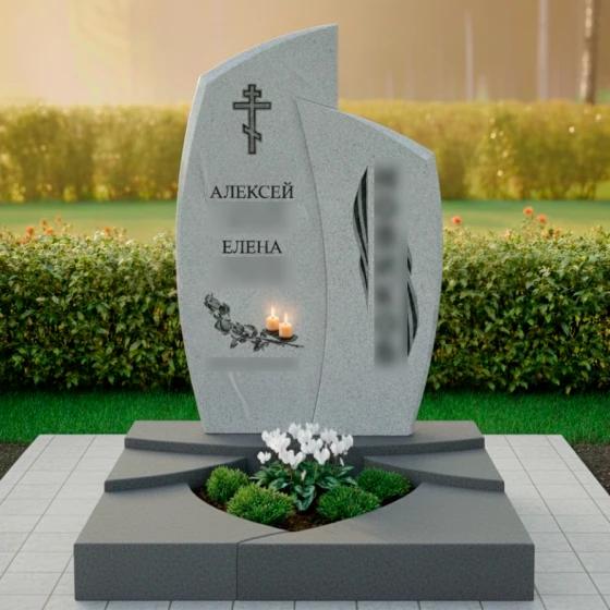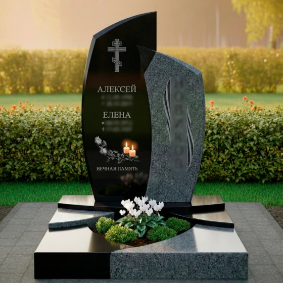 Форма этой модели глубоко символична. Плавная волна, венчающая композицию, олицетворяет жизненный путь — изменчивый, но всегда стремящийся к завершенности. Сочетание двух видов камня подчеркивает союз двух душ, их неразрывную связь и взаимную поддержку. Нижняя часть мемориальной композиции выполнена в виде сложного геометрического цоколя, где чередуются полированные черные и текстурированные серые блоки. Такое решение создает визуальный фундамент, символизирующий незыблемость семейных традиций.
