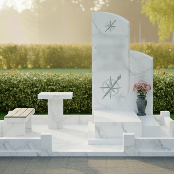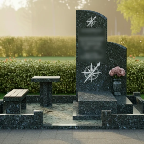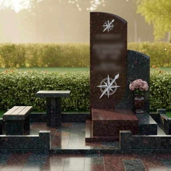 Представленное надгробие из натурального камня (модель 714) — это не просто памятный знак, а гармоничный архитектурный ансамбль, выполненный в современном европейском стиле. Композиция поражает своей лаконичностью и глубоким символизмом. Центральным элементом является вертикальная стела асимметричной формы: левая грань сохраняет строгую вертикаль, в то время как правая плавно уходит в изящный дугообразный изгиб. Эта мягкая волна придает массивному камню визуальную легкость и одухотворенность. Зеркальная полировка основной поверхности создает глубокий блеск, в котором отражается вечность, контрастируя с тонкой художественной гравировкой. На стеле дважды запечатлен уникальный символ — стилизованная роза ветров, совмещенная с кистью художника. Эти детали, выполненные с ювелирной точностью, подчеркивают творческую натуру и многогранность личности ушедшего человека, его стремление к поиску своего пути и созиданию.