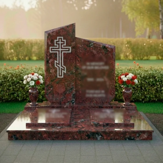 Форма данного памятника несет в себе глубокий философский смысл. Асимметрия верхушек символизирует прерванный жизненный путь, который, тем не менее, находит свое продолжение в высших сферах. Двойная структура стелы идеально подходит для семейного захоронения, олицетворяя неразрывную связь двух душ, их единство и вечный покой под защитой общего купола веры. Массивность конструкции и широкое основание создают ощущение абсолютной защиты и стабильности. Этот мемориальный комплекс спроектирован как "крепость памяти", которая способна противостоять векам, сохраняя первозданный вид и достоинство мемориального места.