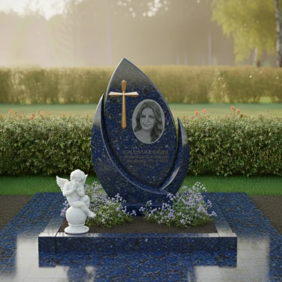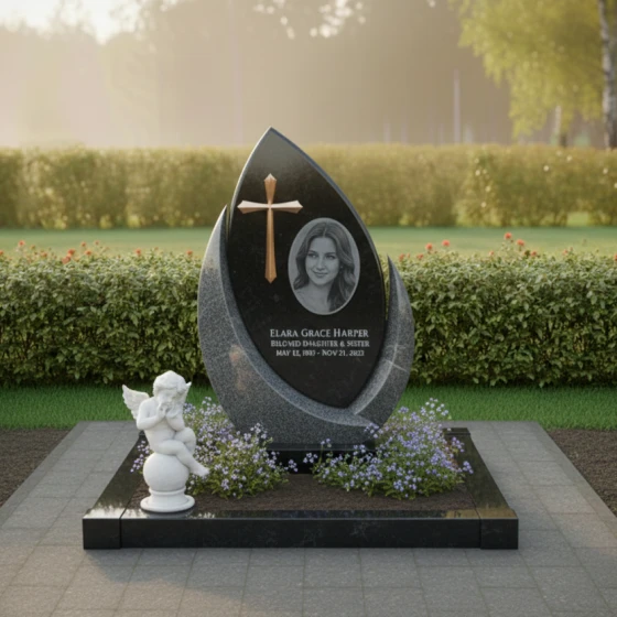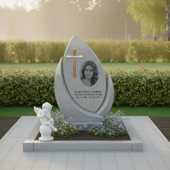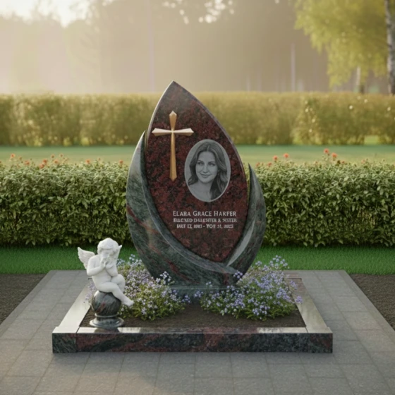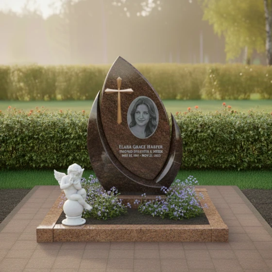 Данная художественная композиция представляет собой истинное воплощение природной грации и тихой скорби, застывшей в камне. В основе дизайна лежит изящная асимметрия: гранитный монумент выполнен в виде раскрывающегося лепестка или застывшего языка пламени, который словно оберегает память об ушедшем человеке. Основной смысловой акцент сделан на двухсоставной конструкции — внутренний темный элемент, несущий на себе основные символы и портрет, мягко вложен в светлую внешнюю «колыбель» из контрастного камня. Такая многослойность придает изделию объем и визуальную глубину, выделяя его на фоне типовых решений.