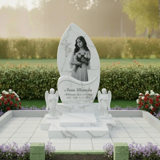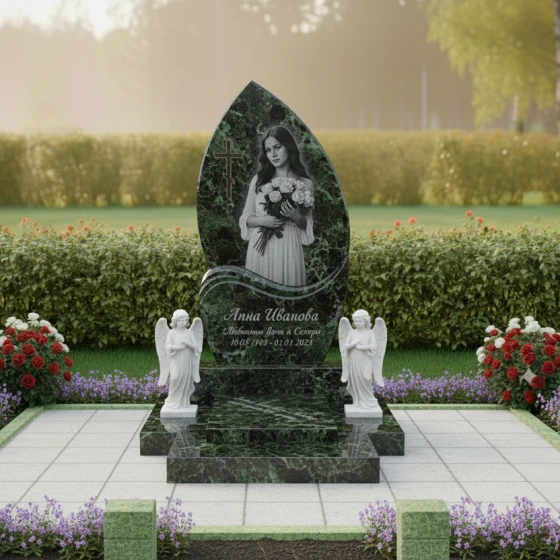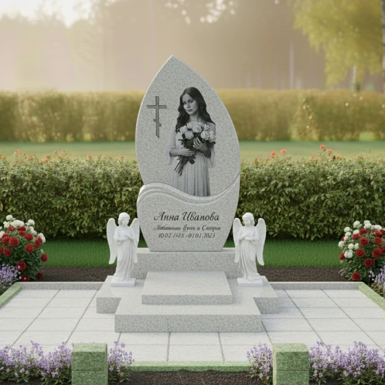 Форма стелы, стремящаяся ввысь, символизирует бессмертие души и её восхождение к свету. Асимметрия композиции подчеркивает уникальность жизненного пути, который никогда не бывает прямолинейным. Две белоснежные скульптуры ангелов, замершие в молитвенном предстоянии у подножия, выступают в роли стражей вечного сна, привнося в ансамбль ощущение небесного покровительства и утешения. Резная волна в основании воспринимается как символ быстротечного времени, которое разбивается о твердыню вечной памяти.