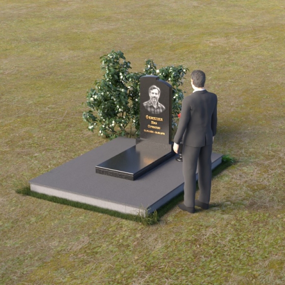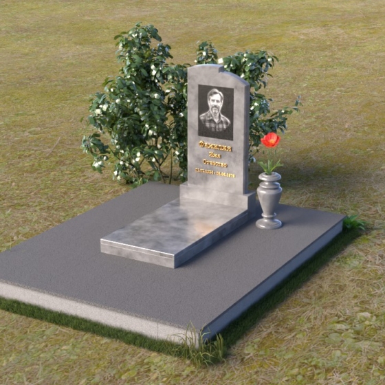 Геометрия модели продумана до мельчайших деталей. Начиная с основания, мы видим широкую плиту, обеспечивающую устойчивость всей конструкции. На ней возвышается горизонтальная плита меньшего размера, выполненная в зеркальной полировке, отражающая небо и окружающий мир, словно запечатлевая в себе мгновения жизни. Вертикальная стела, возвышающаяся над плитой, имеет сглаженные углы и плавные переходы, смягчающие строгость формы. Верхняя часть стелы, с ее деликатными сколами, придает ей уникальность и неповторимость. Рядом со стелой располагается небольшая ваза, выполненная в том же стиле, предназначенная для живых цветов, символизирующих вечную память и любовь.