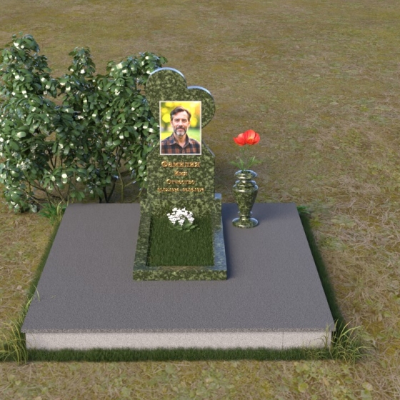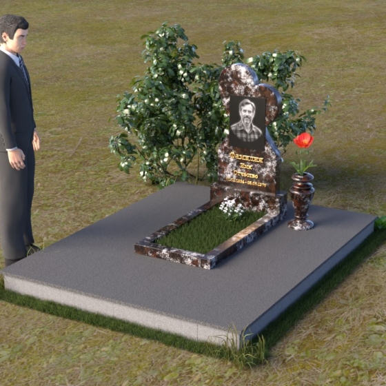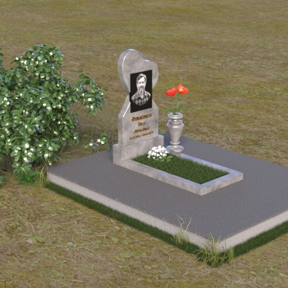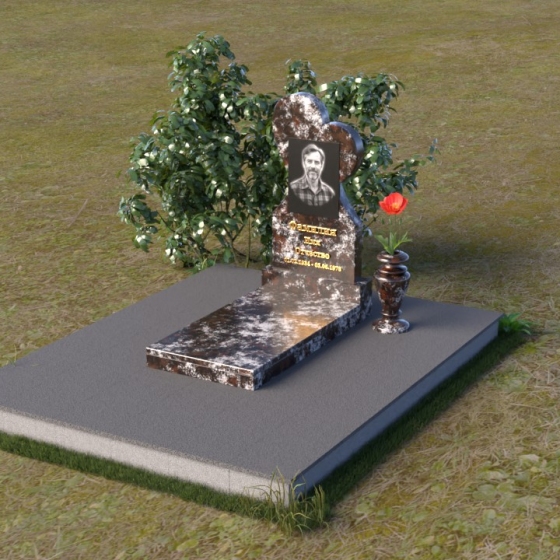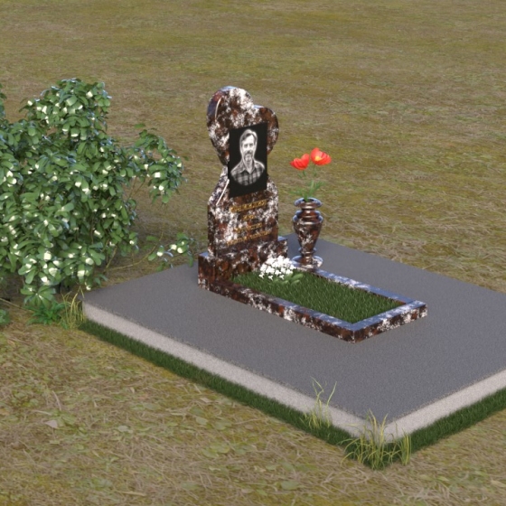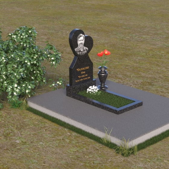 Этот памятник представляет собой изысканное сочетание строгих линий и плавных изгибов, создающее гармоничный и запоминающийся образ. Основная стела выполнена в форме сердца, что является традиционным символом любви и скорби. Верхняя часть сердца плавно переходит в более узкую часть, образуя своеобразный силуэт, устремленный ввысь. Грани стелы тщательно отполированы, что придает камню зеркальный блеск и подчеркивает его глубокий цвет. На лицевой стороне стелы располагается портрет усопшего, выполненный с высокой степенью детализации. Ниже портрета выгравированы имя, отчество и фамилия, а также даты рождения и смерти. Надписи выполнены изящным шрифтом, который придает памятнику благородный вид. Основание стелы выполнено в виде прямоугольной плиты, которая также тщательно отполирована. Плита служит надежной опорой для стелы и обеспечивает ее устойчивость. Фаски на плите аккуратно обработаны, что придает ей законченный вид.