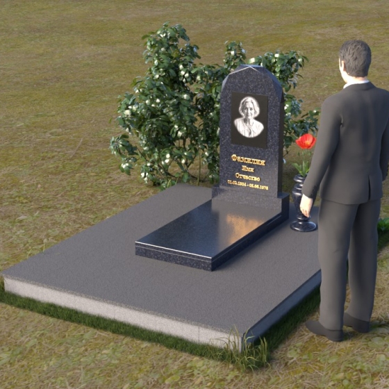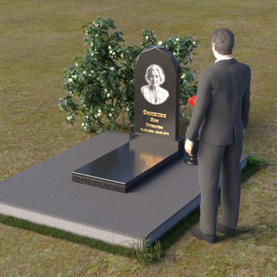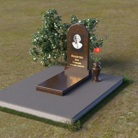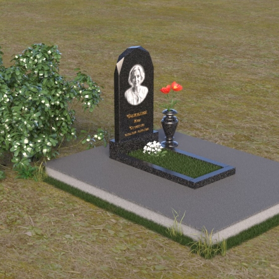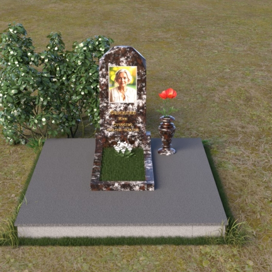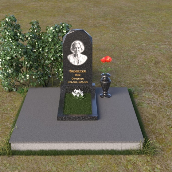 Форма стелы ПВ 069 предоставляет прекрасные возможности для размещения портрета и памятной надписи. Изображение можно расположить в верхней части стелы, где оно будет хорошо освещено и заметно. Золотое тиснение имени и дат жизни на темном фоне гранита создает элегантный контраст и добавляет торжественности. Вертикальное расположение текста гармонично сочетается с формой стелы и позволяет разместить достаточное количество информации, чтобы выразить всю глубину вашей любви и скорби. Рядом со стелой можно установить небольшую вазу для цветов, которая станет символом неувядающей памяти и заботы. Маленькая гранитная плита, расположенная перед стелой, может служить местом для возложения венков или памятных вещей.