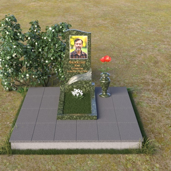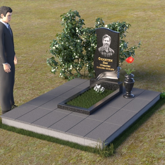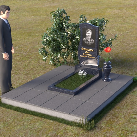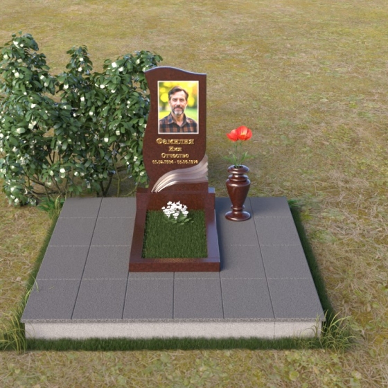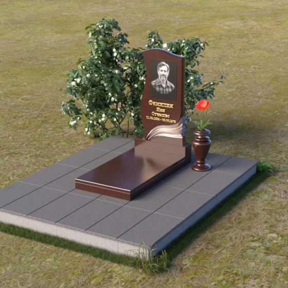 Надгробие из натурального камня ПВ 111 представляет собой элегантную композицию, где плавные линии и строгие формы гармонично сочетаются. Стела имеет форму, напоминающую раскрытую книгу, страницы которой плавно переходят одна в другую, создавая ощущение легкости и устремленности ввысь. Верхняя часть стелы, обрамляющая портрет, имеет скругленные углы и мягкий, волнообразный абрис, словно нежные объятия. Боковые грани стелы искусно обработаны, создавая игру света и тени, подчеркивающую благородство материала. В нижней части памятника расположен декоративный элемент в виде волны, выполненный в светлом тоне, что создает контраст с полированной поверхностью стелы и добавляет композиции динамики. Подставка под стелу выполнена в виде прямоугольной плиты с полированными фасками, что придает ей законченный и элегантный вид.